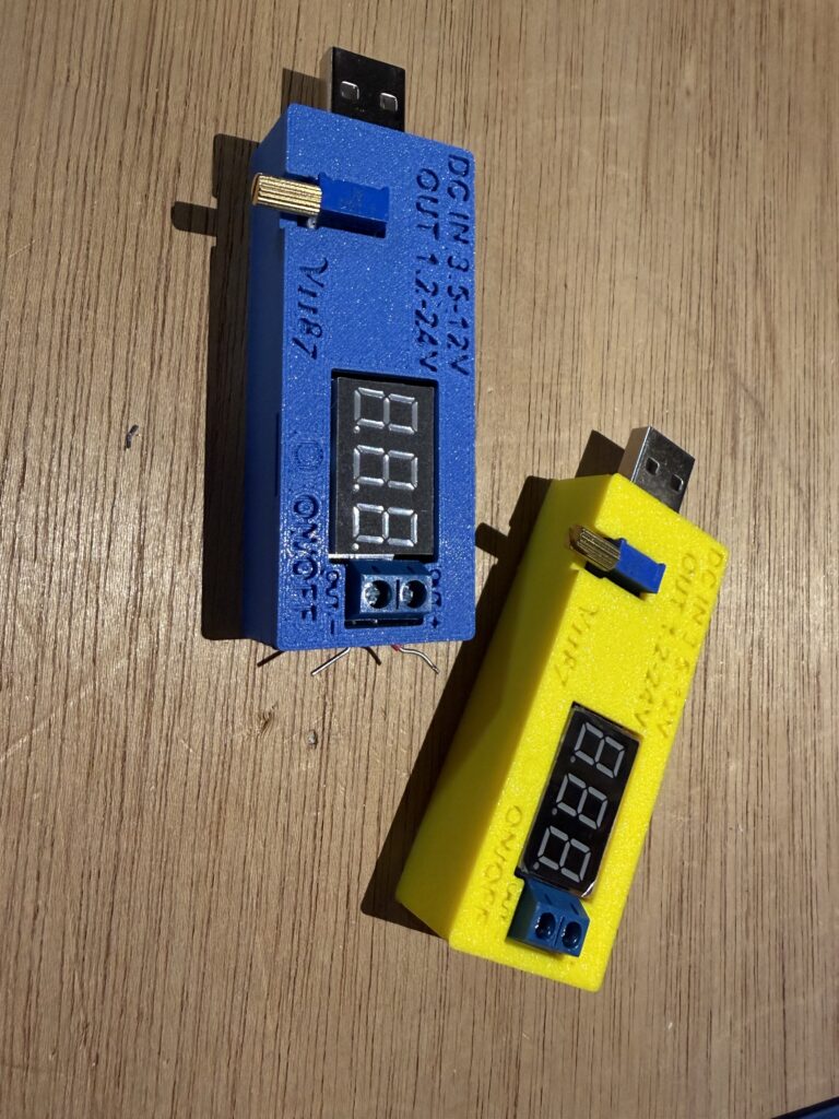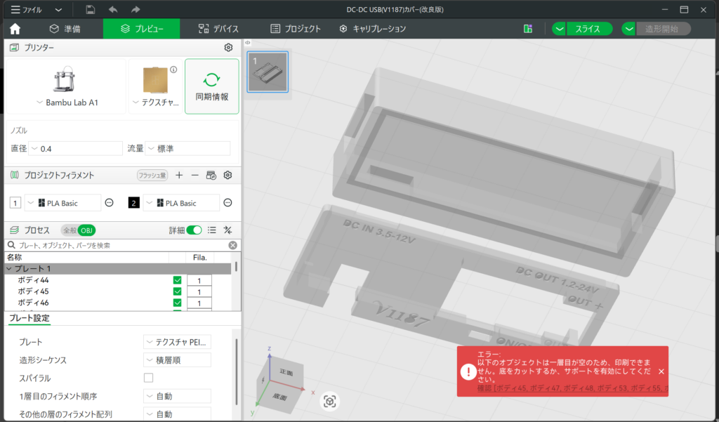 緑色のケースと、黄色のベースプレートを比較すると、PLA特有の反りがひどい。